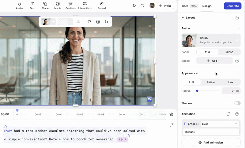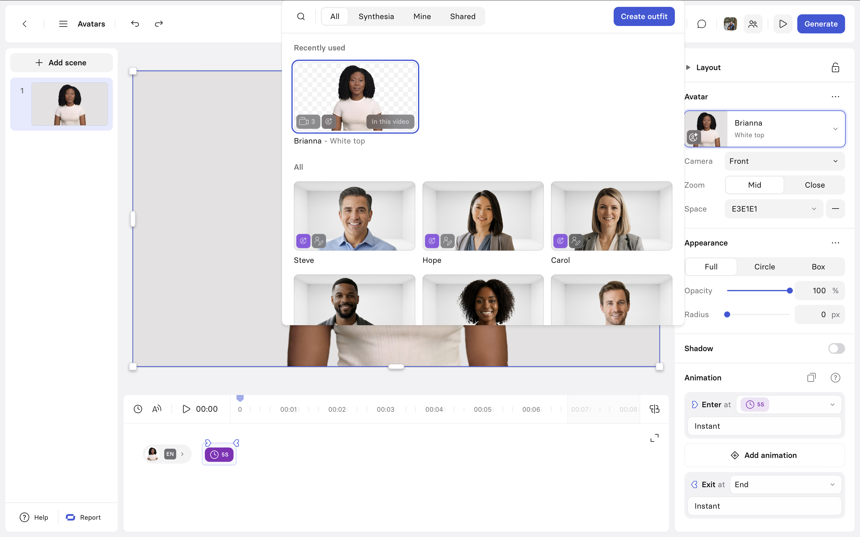 Avatarbutton in the toolbar at the top of the editor. - Browse through or search for avatars that are included in your plan.
