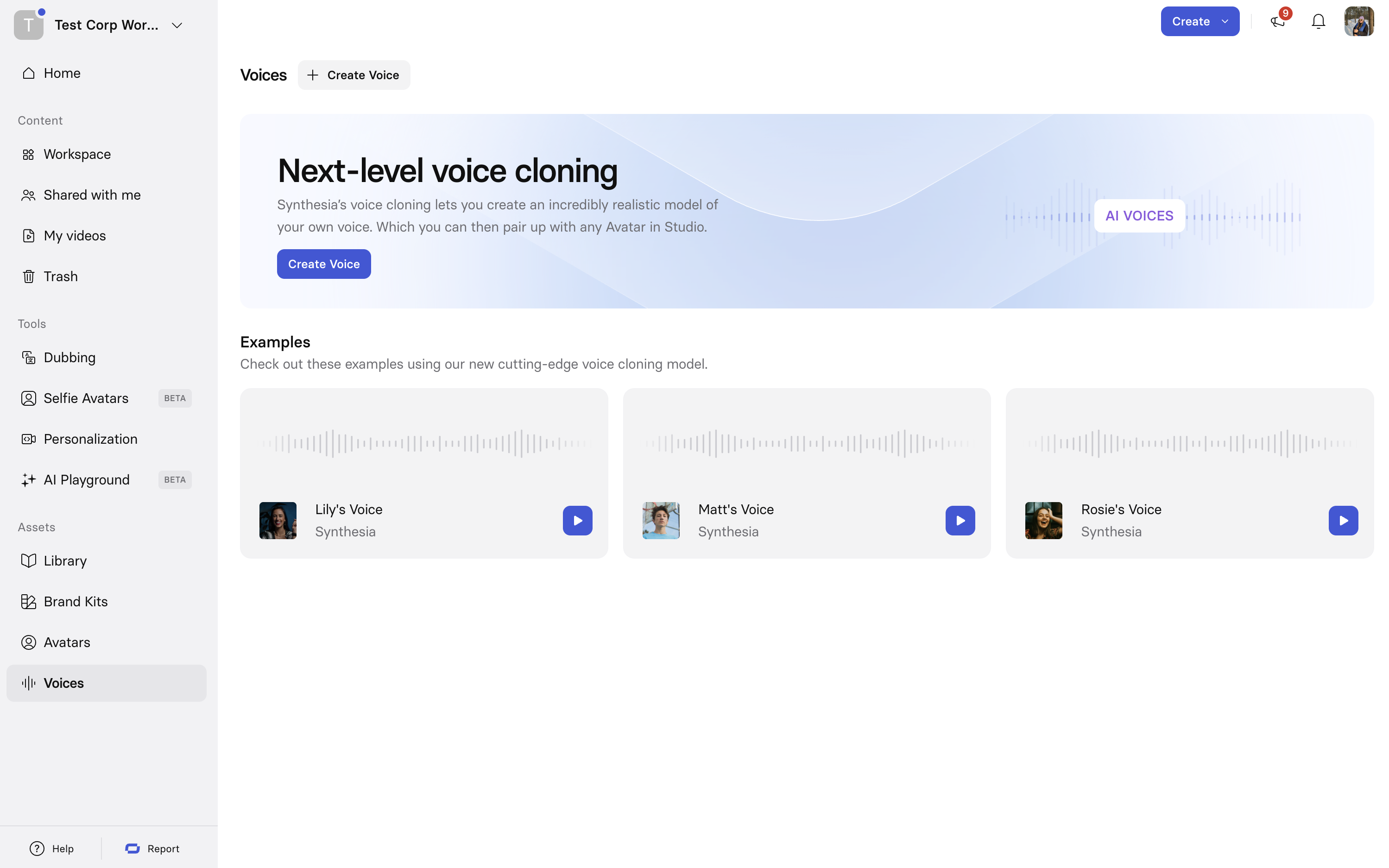 - Go to the Voices page in your Synthesia account.