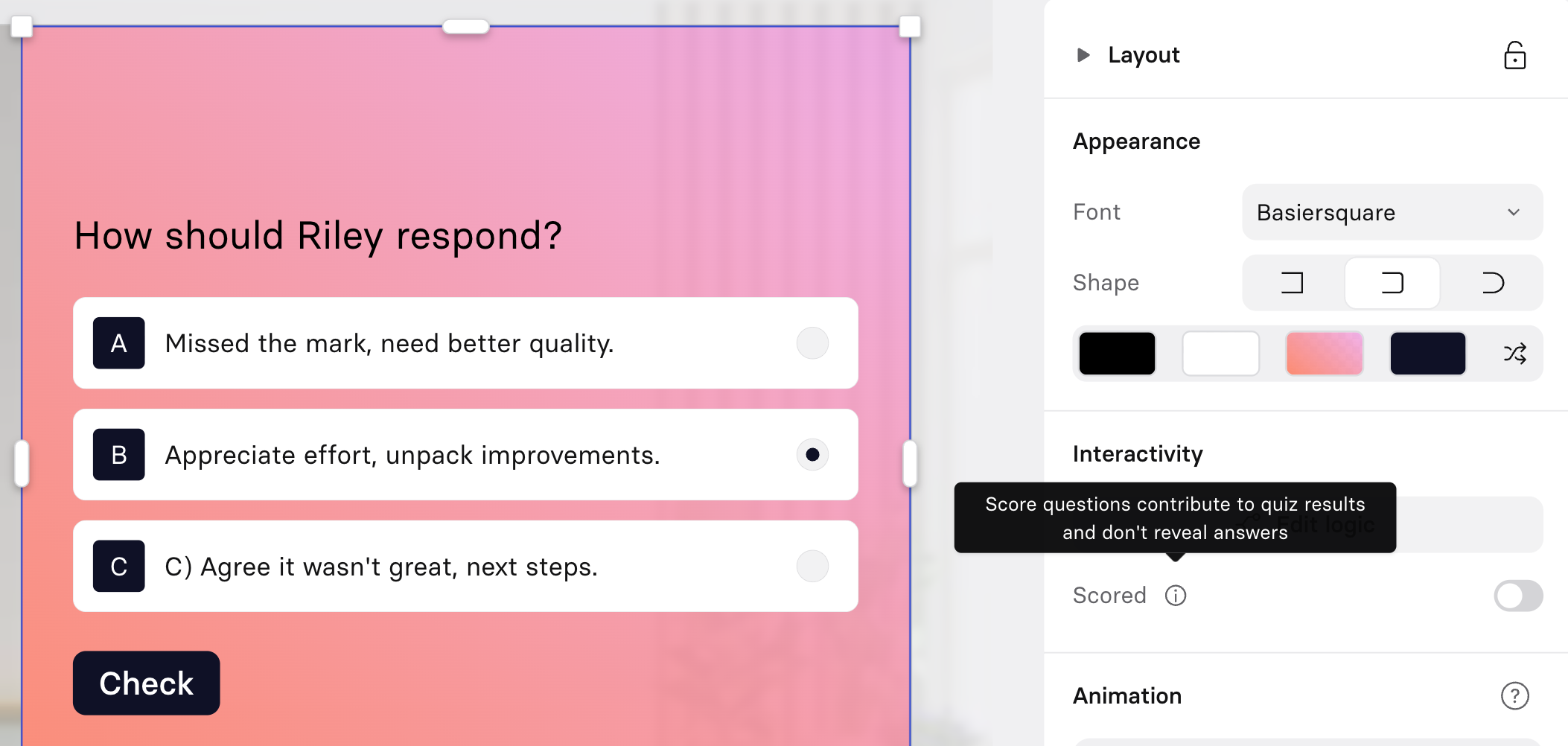 To enable practice mode, select the quiz component and toggle off the Score option from the inspector panel in the Interactivity section.