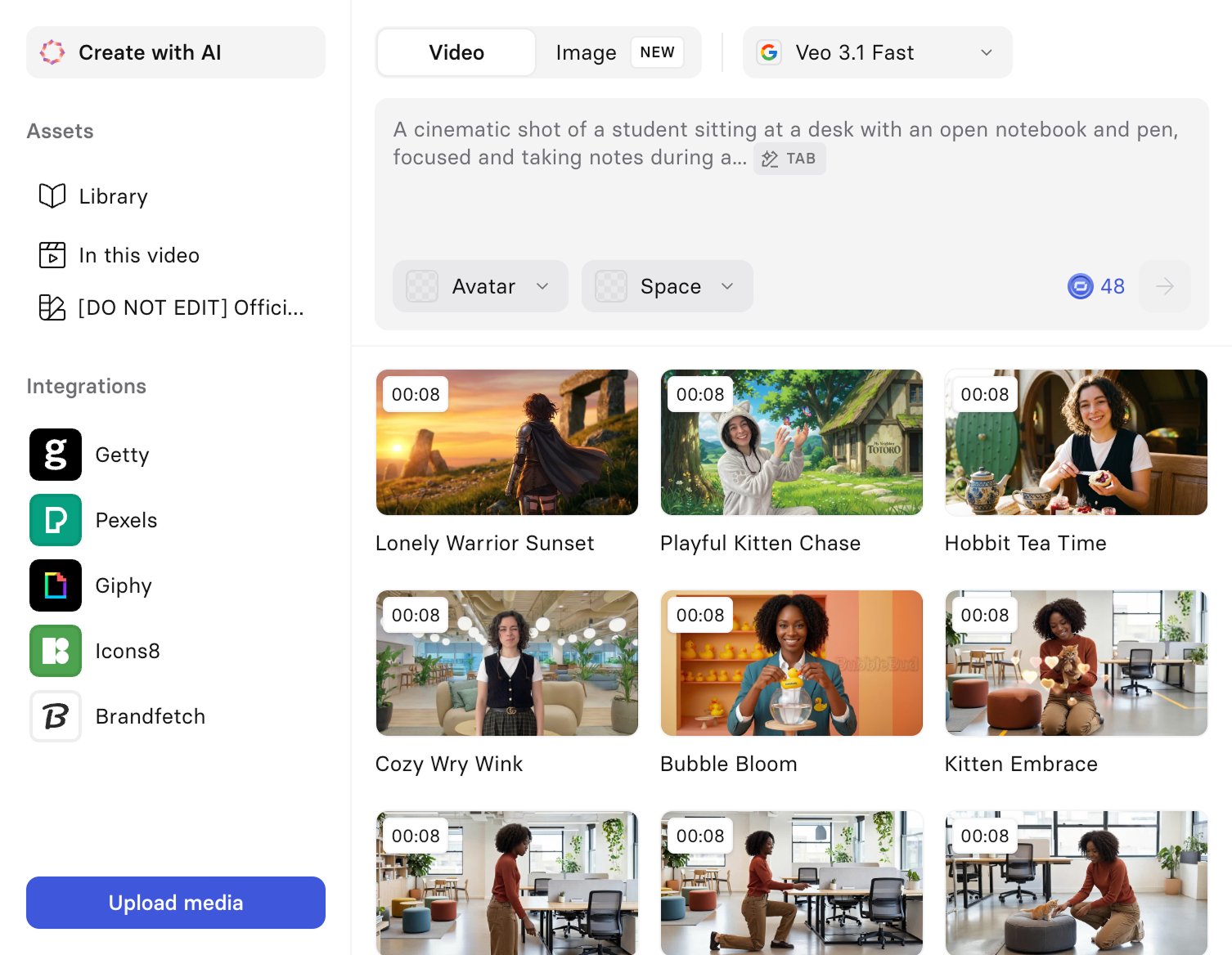 - Veo 3.1 Fast: 48 credits per video