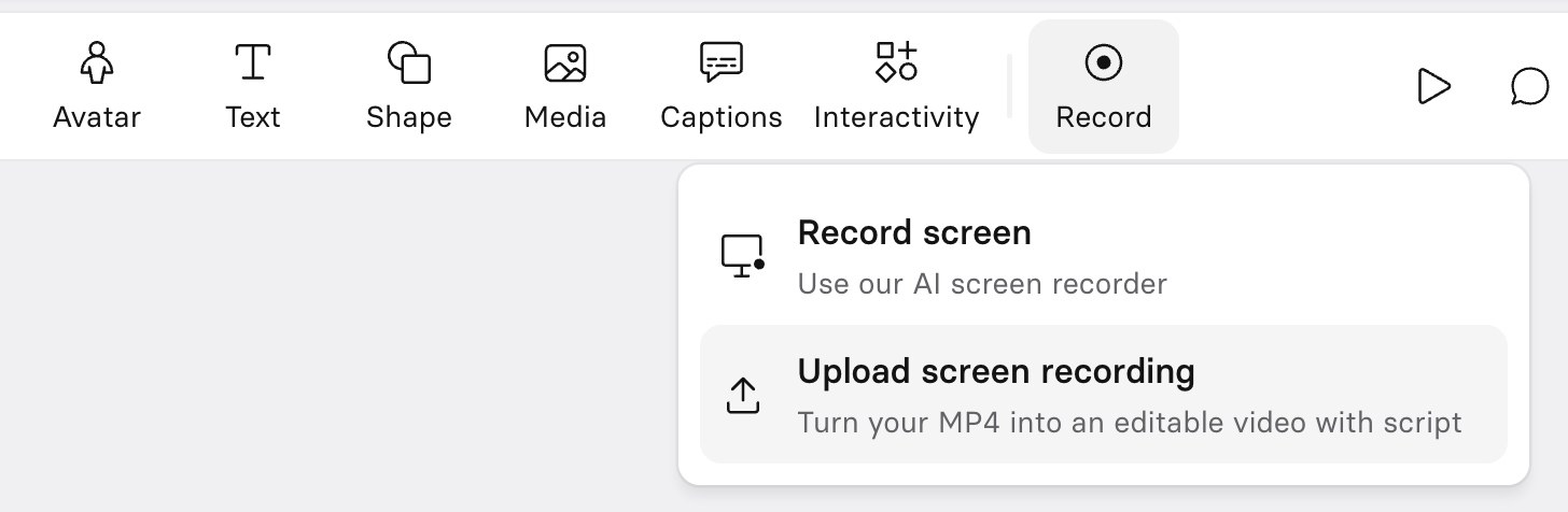 Record screen: Use the AI screen recorder browser extension to capture your screen live.Upload screen recording: Import an MP4 you recorded and/or edited with an external tool (such as Camtasia or Loom).