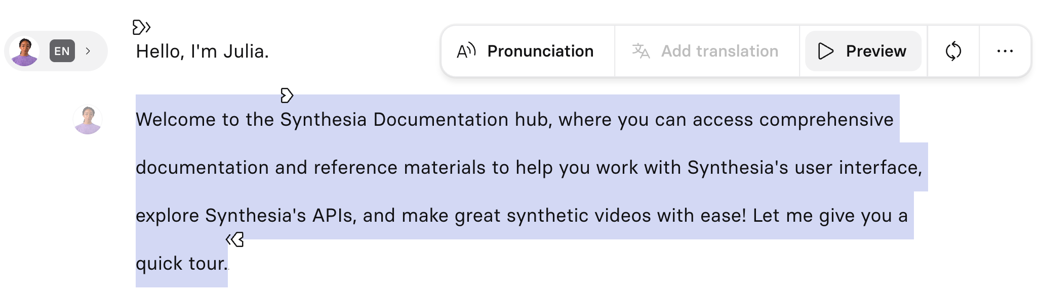 Use speech regeneration to get an alternative take of the same script with the same voice, without changing your script, settings, or visuals. When you regenerate speech for a line or paragraph, Synthesia will keep your script, language, and voice exactly the same while producing a new audio take with subtle differences in timing, intonation, rhythm, and emphasis on certain words.