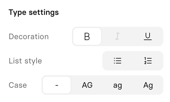 Access additional typographic controls. Clicking Type settings opens a sub-panel with the following options:
