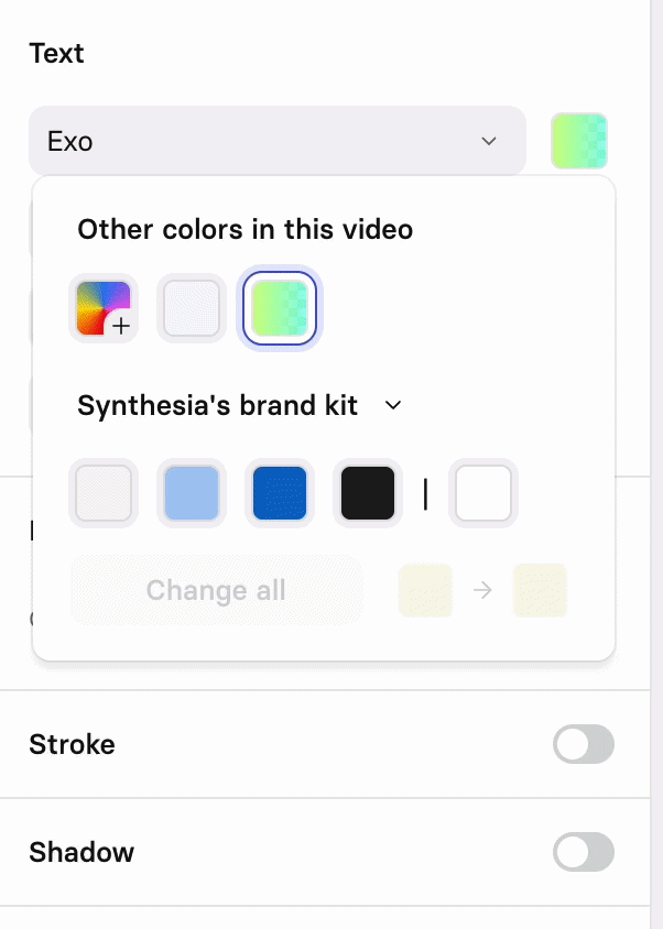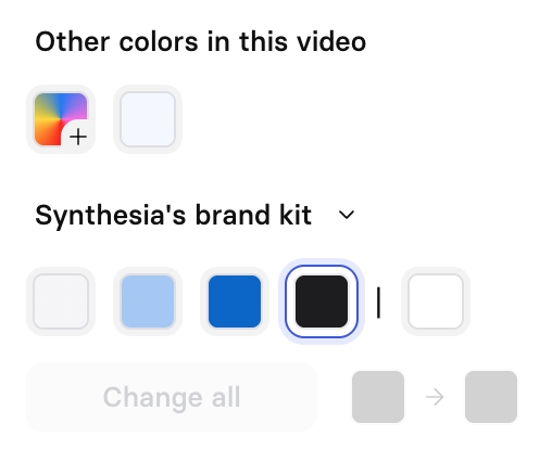Change allIf you click Change all after changing a color, Synthesia replaces ALL occurrences of that color by the new one across your whole video.