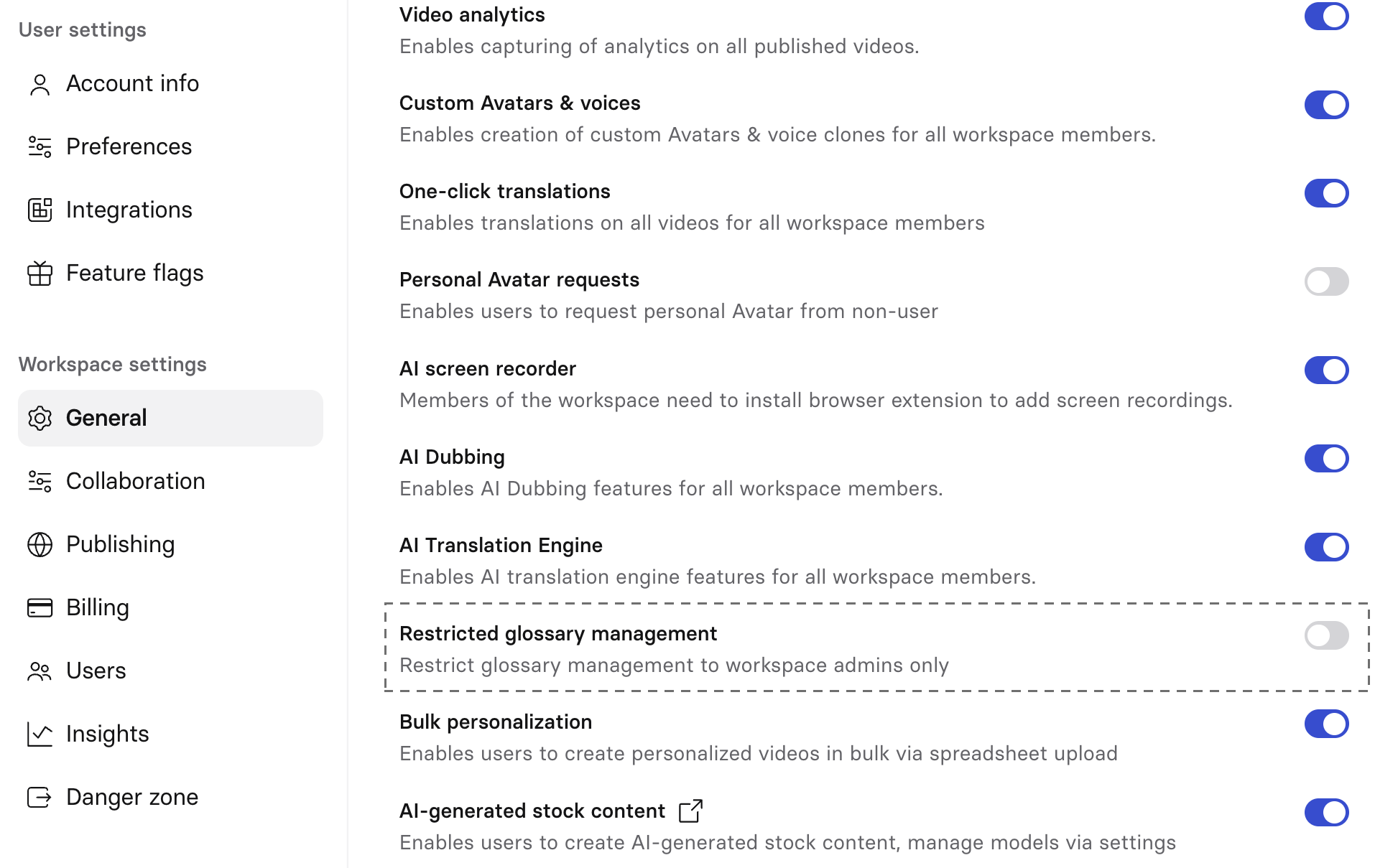 - Toggle on to restrict glossary management—only workspace administrators will be able to add new glossary terms and edit or remove existing glossary entries.