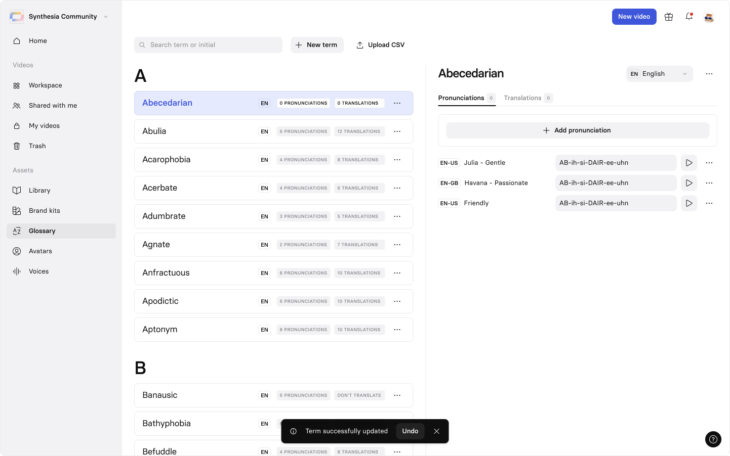 Use the Translation Glossary to define how key terms should be translated across your Synthesia workspace.