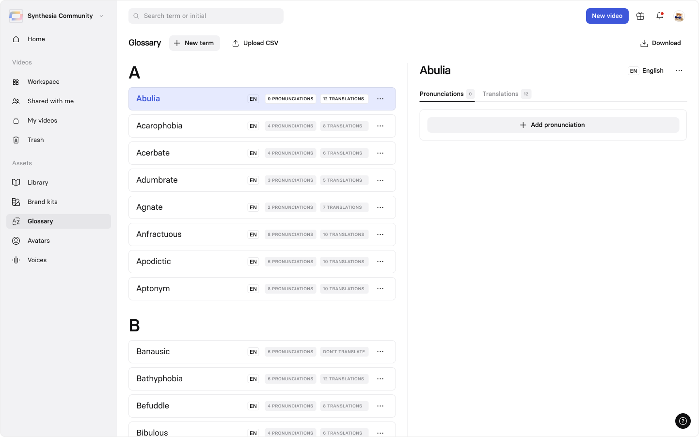 Import existing glossaries via CSV: Bring your existing term lists into Synthesia.