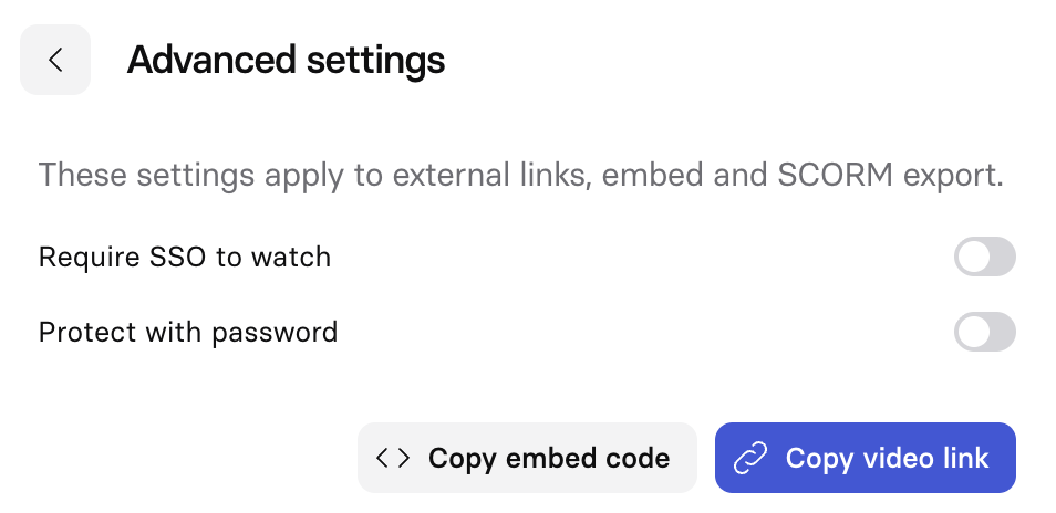 | Require SSO to watch | Require SSO authentication before anyone can view the video on the share page, in embeds, or via SCORM. |