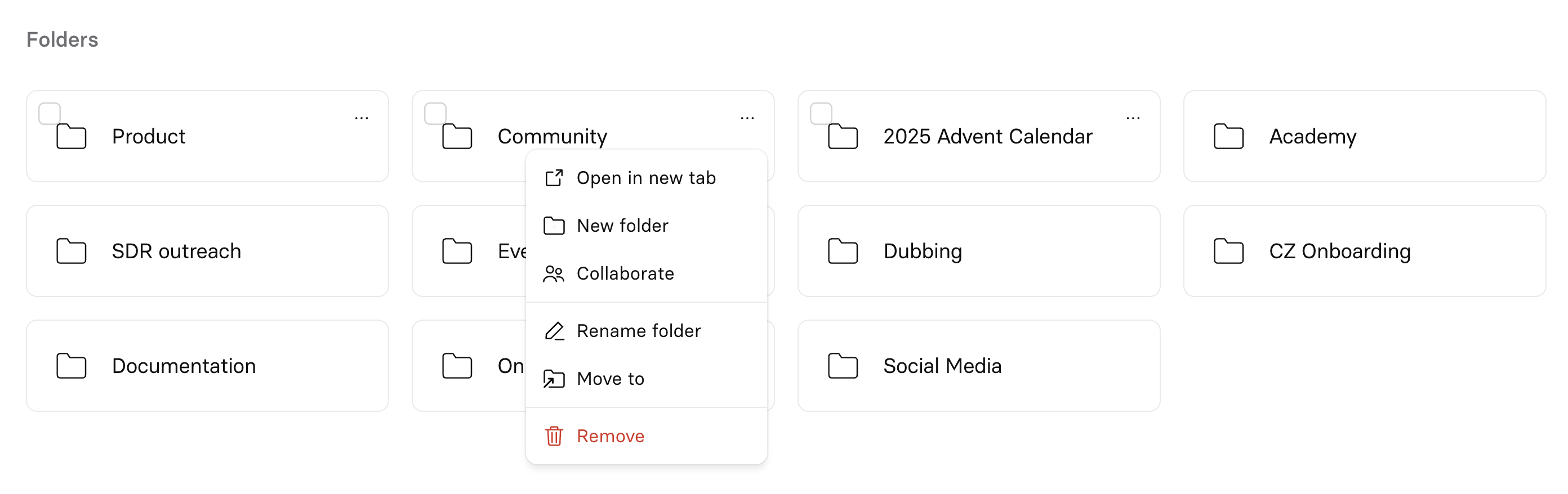 - Remove: Delete the folder (available in Trash for 30 days)