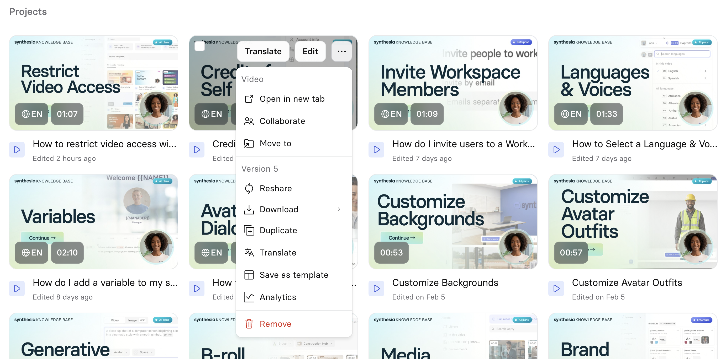 Hover over a video and click on the Translate button to translate your video, Edit to go to the video edit page, or click the three dots for more options: